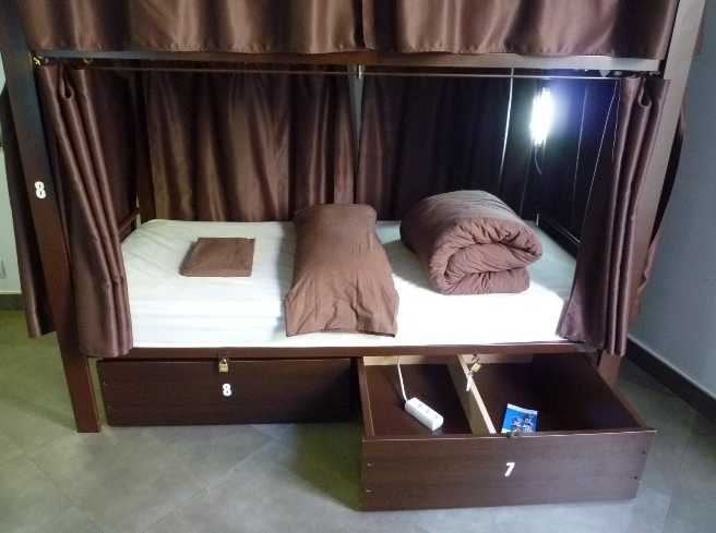 また各ベッドにカーテンがついており、夜中に電気をつけて本も読める。